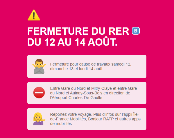 Du samedi 12 au lundi 14 août inclus, le RER B ne circulera pas entre Gare du Nord et Mitry-Claye. L’aéroport de Paris-Charles de Gaulle ne sera donc pas desservi. Le trafic sera interrompu dans les deux sens de circulation pour permettre de réaliser d’importants travaux de maintenance et de modernisation. Il est fortement recommandé de reporter les déplacements et en particulier le lundi 14 août. Si vous devez impérativement vous déplacer, Mappy vous propose les différentes alternatives. Consultez le détail des travaux sur le RER B sur Bonjour RATP.